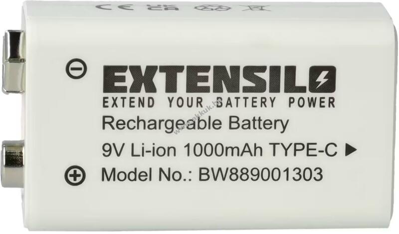Extensilo 9V Block akku USB-C aljzat, 6F22, 6LR61, Li-Ion, 8.4V, 1000mAh + USB-C kábel 1m