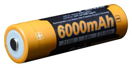 A Fenix 21700 6000 mAh újratölthető akkumulátor (ARB-L21-6000B) védőelektronikával (védett) és saját USB-C töltőcsatlakozóval a legnagyobb valós kapacitást biztosítja a piacon. A Li-ion újratölthető akkumulátorokat nagyon nagy kapacitás jellemzi, nem szenvednek memóriahatástól vagy önkisüléstől. Töltése történhet az USB-C csatlakozóhoz csatlakoztatott kábellel (pl. számítógép, powerbank vagy mobiltelefon töltőjéről) vagy hagyományos Li-ion töltővel. Ugyanakkor az akkumulátor powerbankként is használható, és más USB-s eszközöket is tölthetünk róla. Figyelem , az akkumulátor méretei 22 milliméter x 77 milliméter , így átmérője nagyobb, mint a hagyományos 21700-as típusú Li-ion akkumulátoroké. Így csak néhány zseblámpához és fejlámpához illeszkedik . A következő Fenix zseblámpákkal kompatibilis: TK17, TK22R, TK30R, HT18R, HT18R, LD45R, PD40R V3.0, PD36R V2.0, Fenix PD45R ACE, Fenix WF25RM. A Fenix akkumulátor védelme belső biztonsági mechanizmusokból és védőelektronikából áll. A hozzáadott elektronikus áramkörök megakadályozzák a cella túltöltését, túlzott lemerülését. Védik a rövidzárlat vagy a túl nagy áramfelvétel ellen. Ha az akkumulátor elektronikája úgy ítéli meg, hogy a határértékeket elérte, biztonságosan lekapcsolja a cellát. A belső védelem egy szeparátorból, a legkorszerűbb túlmelegedés elleni védelemből (HRL - Heat Resistance Layer) és egy speciális robbanásgátló szelepből áll. Abban az esetben, ha a cellában a gáznyomás meghalad egy bizonyos határértéket, a belső elválasztó elválasztja az elektródákat az akkumulátoron belül, és így de facto megszakítja az exoterm reakciót, a robbanásbiztos szelep pedig az akkumulátoron kívülre engedi a túlzott gáznyomást. Az elektronikus és mechanikus (hőmérséklet és nyomás) védelem kombinációja a Fenix akkumulátorokat a legbiztonságosabb li-ion akkumulátorok közé teszi. Az akkumulátor  77 milliméteres hossza (a védőelektronikával együtt) miatt csak olyan töltőkben tölthető, amelyeket erre a hosszúságra terveztek. Az ajánlott töltőket lásd alább.
