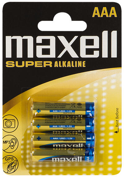 Buborékcsomagolás 4 darab kiváló minőségű AAA alkáli elemmel a Maxell-től. - Univerzális, beleértve a fényképezőgépeket, mp3 lejátszókat, távirányítókat, navigációt- Megnevezés: LR3, AAA- Feszültség: 1,5 V- Csomagolás: buborékcsomagolás - 4 darab