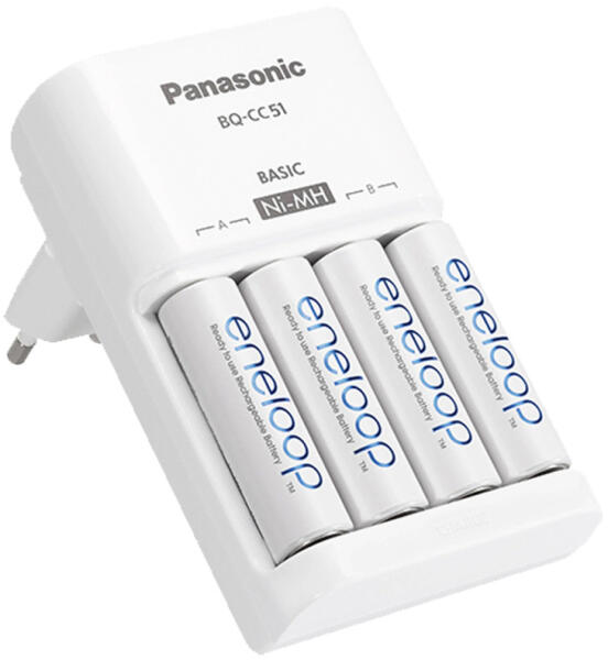 Az Eneloop akkuszett tartalma: akku töltő + 4 db 2000 mAh AA Eneloop akkumulátor Panasonic Eneloop BQ-CC51 típusú, 4 töltőhelyes akkumulátor töltő, 2 vagy 4 db AA/AAA NiMH akkumulátor töltéséhez, 4 db Panasonic eneloop AA, 2000 mAh kapacitású akkumulátorral. Megújult, műanyag mentes csomagolásban. Továbbfejlesztett, a termelési folyamat során napenergiával töltött BK-3MCDE akkumulátorokkal, melyek minimális kapacitása 2000 mAh, akár 2100 töltési ciklus élettartamúak, 10 évig tartják töltöttségük 70%-át, mely mellett alacsony hőmérsékleten, akár -20°C-on is használhatóak. Jellemzők